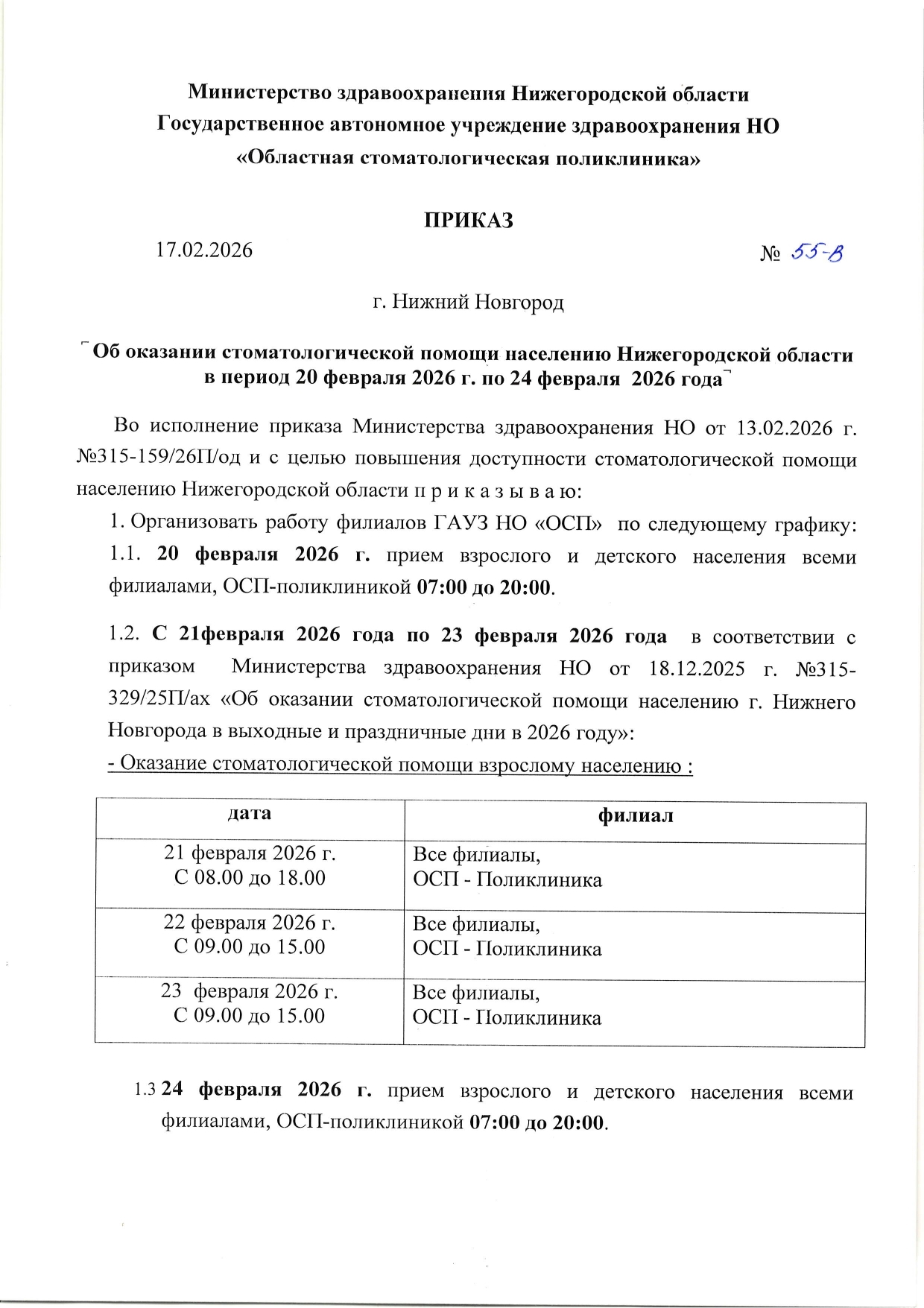 График работы филиалов Нижегородской стоматологии 21-24 февраля