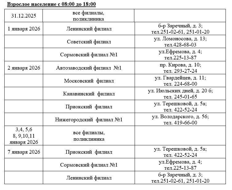 - в детских отделениях Ленинского, Московского, Канавинского, Приокского, Сормовского № 1, Кстовского филиалов ГАУЗ НО «ОСП» - в дни их дежурств;